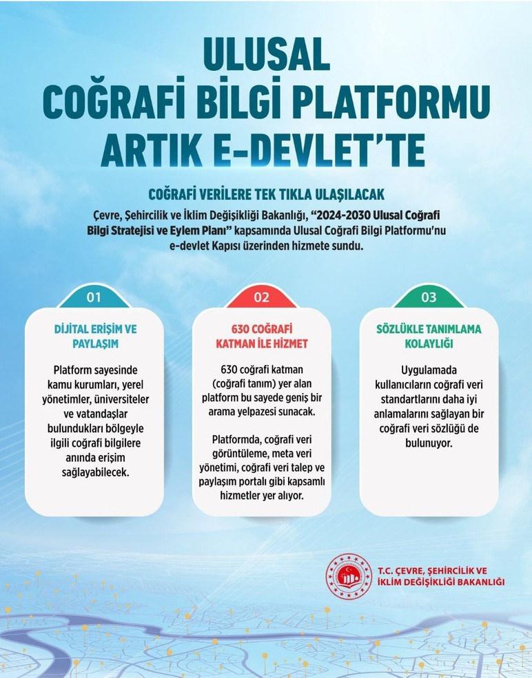 Coğrafi Bilgi Sistemleri Genel Müdürlüğümüz tarafından hazırlanan “2024-2030 Ulusal Coğrafi Bilgi Stratejisi ve Eylem Planı” Resmi Gazete’de yayımlanarak yürürlüğe girdi. Yeni düzenlememizle özellikle afet ve acil durumlarda ihtiyaç duyulan kritik coğrafi veriler paylaşıma açılarak bilgi akışı hızlanacak. Eylem planımızın ilk adımı olarak Ulusal Coğrafi Bilgi Platformu’nu e-Devlet Kapısı üzerinden vatandaşlarımızın kullanımına açtık. Kamu kurumları, yerel yönetimler ve üniversiteler ihtiyaç duydukları tüm verilere tek tıkla ulaşılabilecek.”