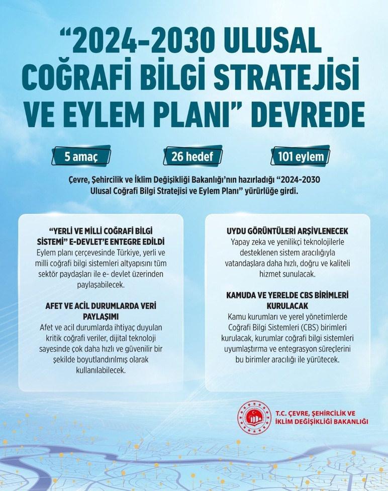 Çevre, Şehircilik ve İklim Değişikliği Bakanlığı’na bağlı Coğrafi Bilgi Sistemleri (CBS) Genel Müdürlüğü tarafından hazırlanan “2024-2030 Ulusal Coğrafi Bilgi Stratejisi ve Eylem Planı” ile ülkemizin coğrafi bilgi sistemleri alanındaki hedefleri ve yol haritası belirlendi.