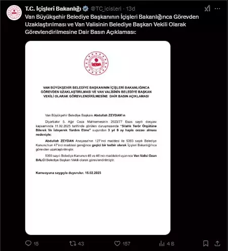 Van Büyükşehir Belediye Başkanı Zeydan, Diyarbakır 5. Ağır Ceza Mahkemesince “silahlı terör örgütüne üye olmamakla birlikte örgüte yardım etmek” suçundan verilen 5 yıl hapis cezasının Yargıtayca bozulmasının ardından yeniden yargılandığı davada 3 yıl 9 ay hapis cezasına çarptırılmıştı. Bu gelişmenin ardından Zeydan, İçişleri Bakanlığı tarafından görevden uzaklaştırılarak yerine Van Valisi Dr. Ozan Balcı atandı.